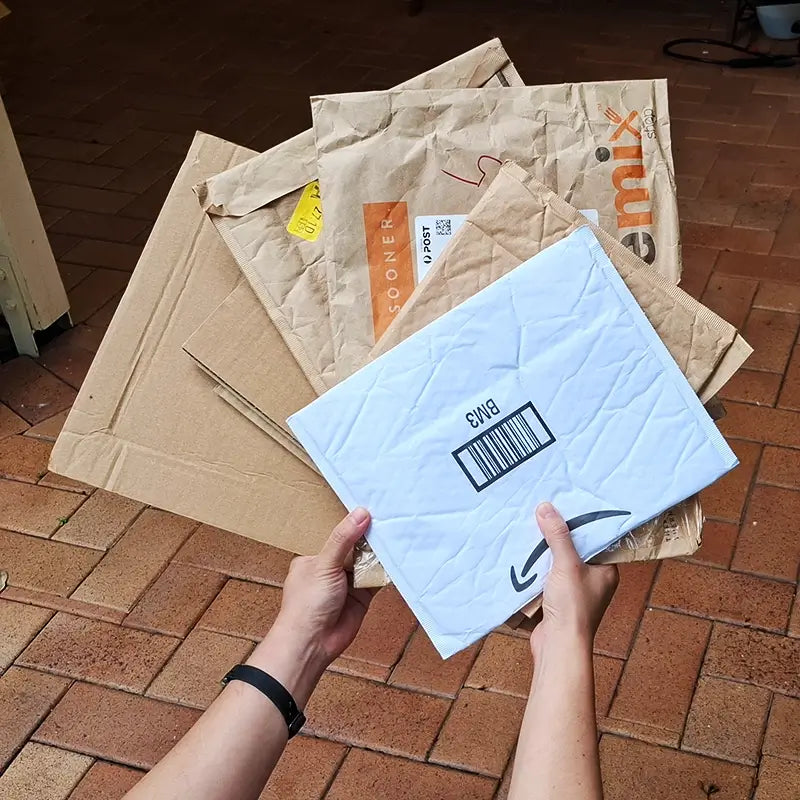 I collect pre-used packaging such as bubble wrap, cardboard and padded envelopes and use them for shipping. Where possible I buy second hand art supplies and equipment such as paints, brushes, canvases and electronics.